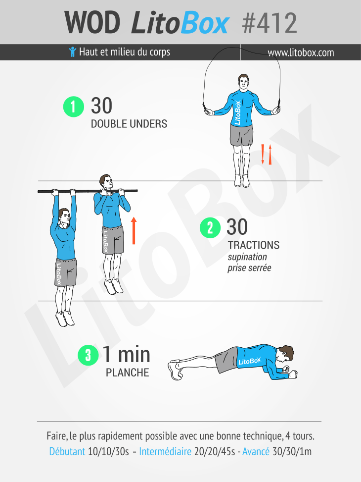 | Avancé | 30 DU ou 90 sauts 30 tractions ou pompes 1 minute de planche |