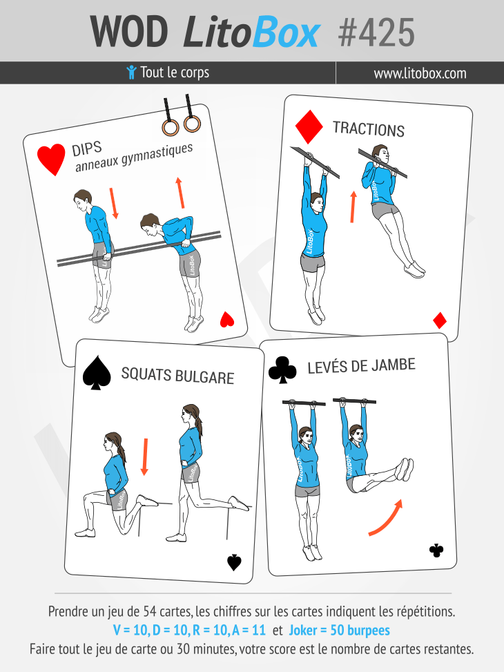 Challenge Litobox avec un jeu de cartes à jouer ! Un exercice est associé à chaque enseigne et la valeur de la carte indique le nombre de répétition à effectuer pour cet exercice. Retournez une carte et vous avez l’exercice et les répétitions pour cet exercice 😉 . Pour les honneurs (figures et As), vous comptez 10 répétitions pour les valets, dames et rois et 11 répétitions pour les As … et pour les Jokers c’est 50 burpees !