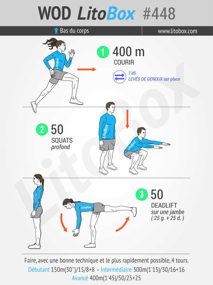 | Intermédiaire | courir 300 m ou 1’15 courir sur place 30 squats profonds 32 deadlifts (16+16) |