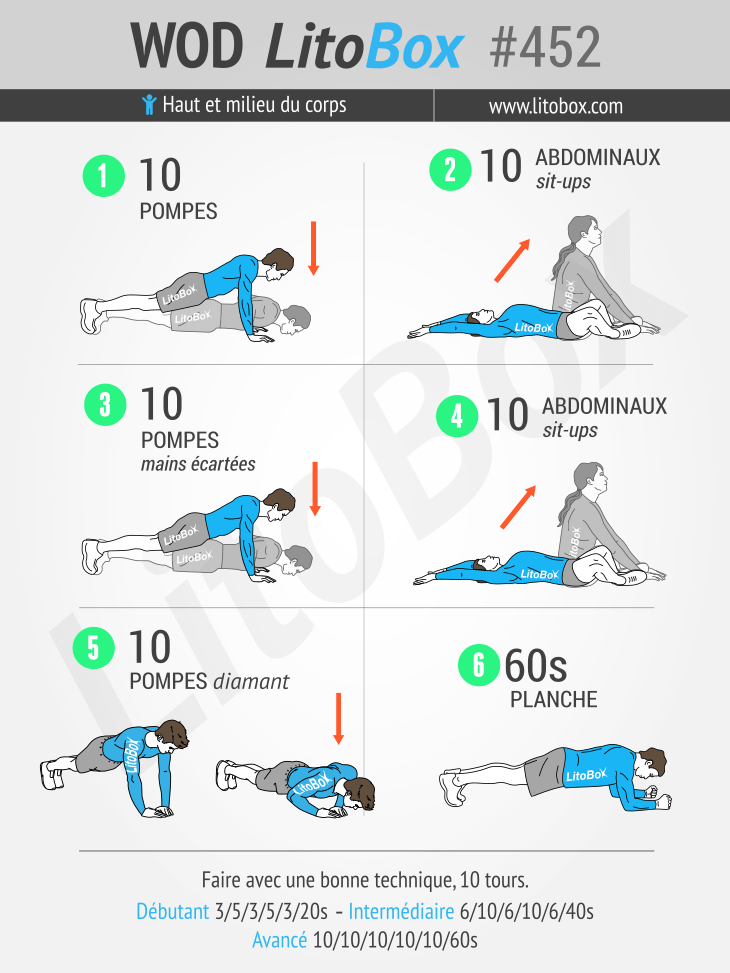 Wod trop accès sur les épaules pour moi. Malgré l’échauffement, j’ai vite des douleurs au niveau des articulations à force d’enchaîner pompes/planches.