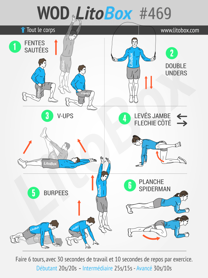 Faire 6 tours avec 30 secondes de travail et 10 secondes de repos par exercice de :