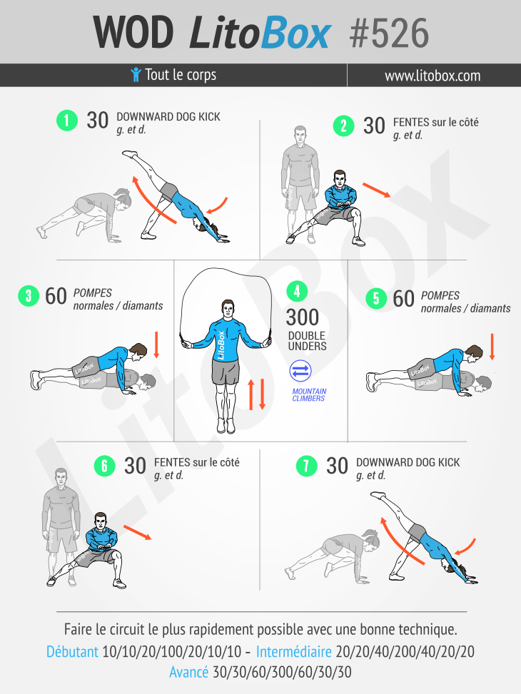 28 minutes en intermédiaire avec des jumping-jack à la place des double under. Les pompes ça fait mal !