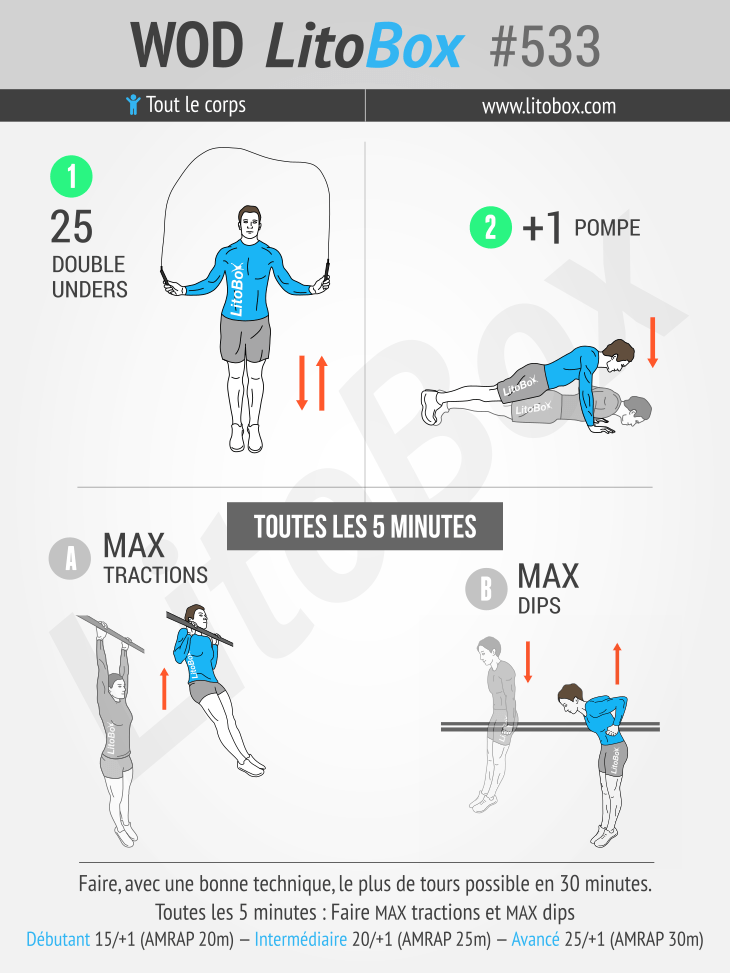 - Toutes les 5 minutes : faire le maximum de tractions et le maximum de dips en 1 série.