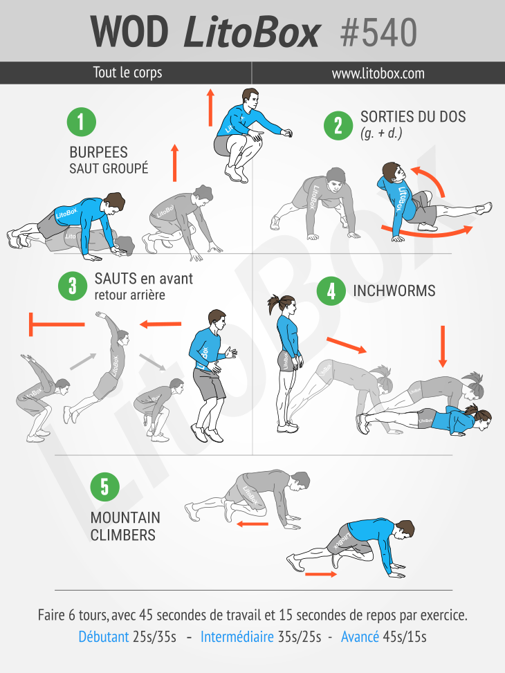 Faire 6 tours avec 45 secondes de travail et 15 secondes de repos par exercice de :