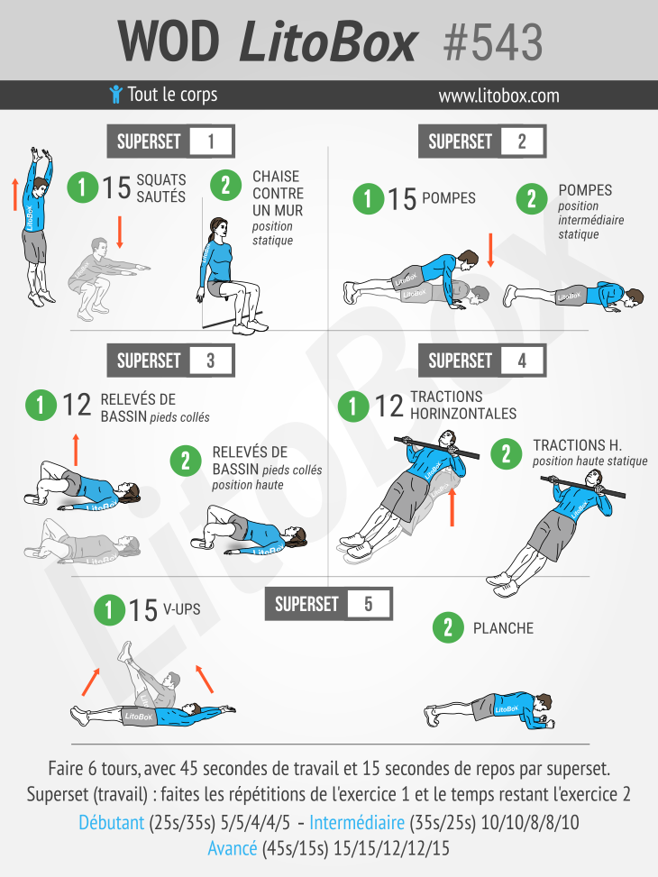 Chaque superset permet de travailler principalement : les jambes, les pectoraux, les fessiers, le dos et les abdominaux.