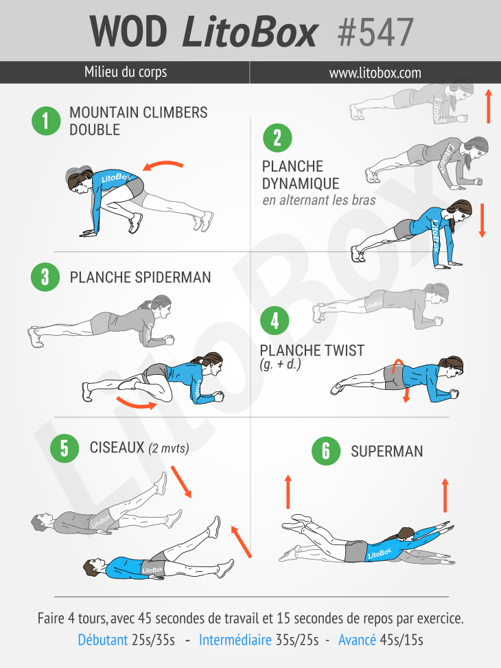 Faire 4 tours avec 45 secondes de travail et 15 secondes de repos par exercice de :