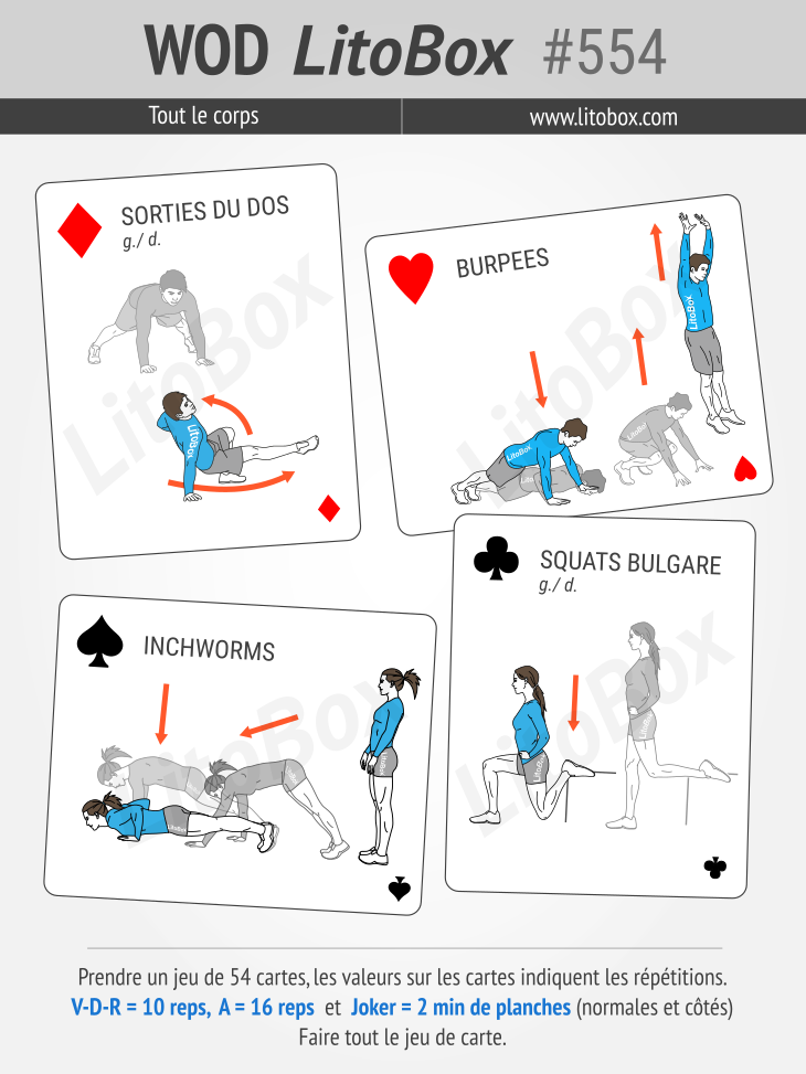 On peut le réaliser en binôme et à ce moment-là avec 54 cartes, on peut faire deux ou trois séances à la suite, mais seul 54 cartes à enchaîner suffisent…amplement!