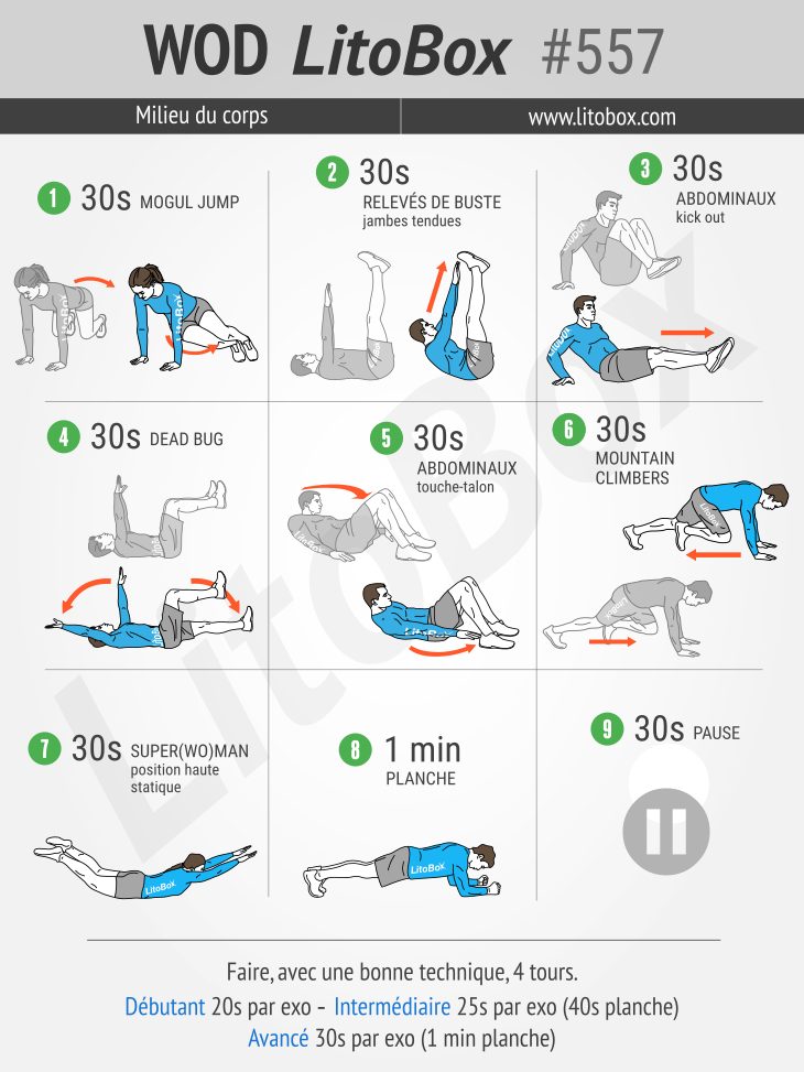 | Débutant + | 20s par exercice avec 30s de planche |