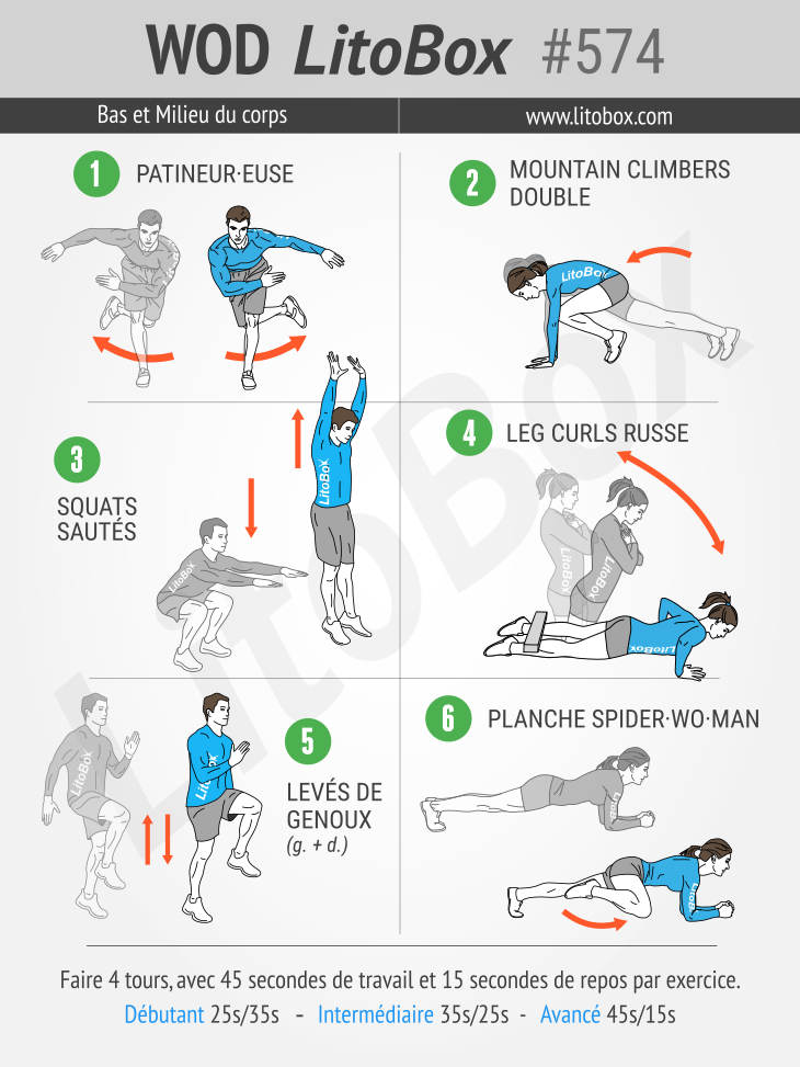 Faire 4 tours, avec 45 secondes de travail et 15 secondes de repos par exercice :
