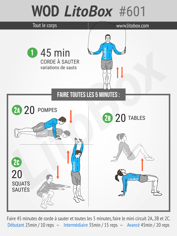 Faire 45 minutes de corde à sauter et toutes les 5 minutes faire :