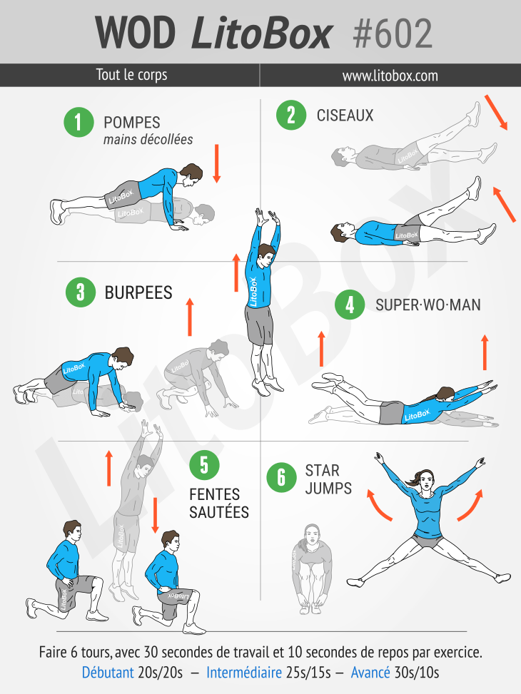Faire 6 tours, avec 30 secondes de travail et 10 secondes de repos par exercice de :