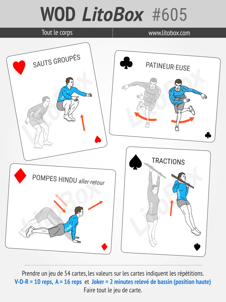 Je pensais ne jamais y arriver. Et j’ai fait tout le jeu en un peu plus de 30 minutes. J’ai adapté : 10 rép pour les figures et le nombre de la carte pour les autres cartes (donc 1 pour l’as) et des cobras à la place des tractions. Merci beaucoup, c’est très ludique et dynamique, ça fait transpirer un max et ça donne confiance en soi !
