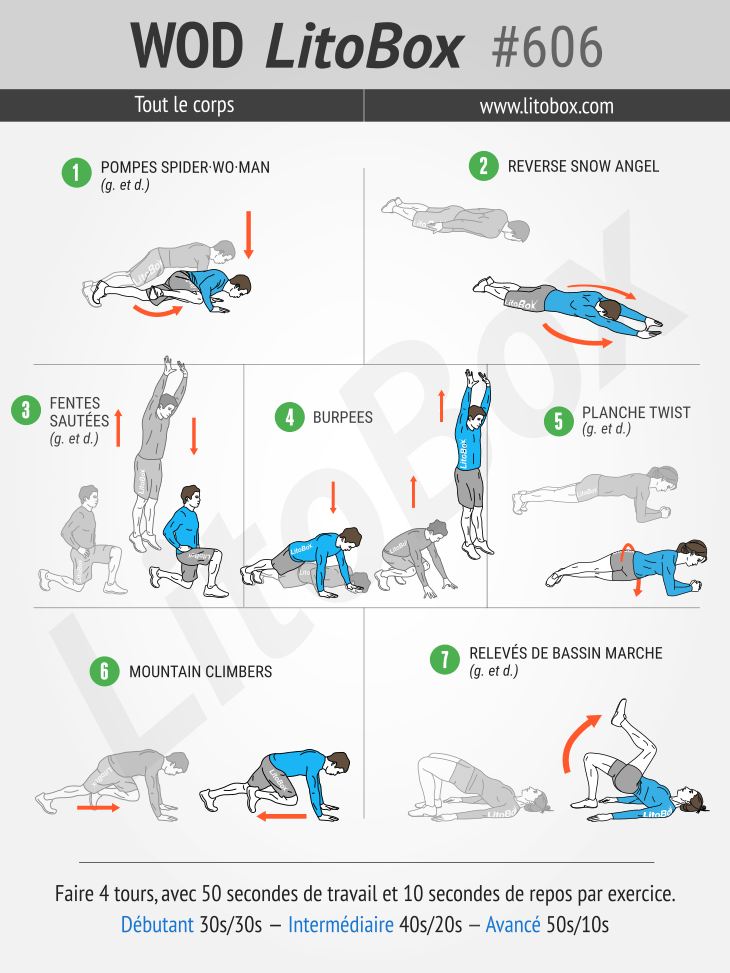 Faire 4 tours, avec 50 secondes de travail et 10 secondes de repos par exercice de :