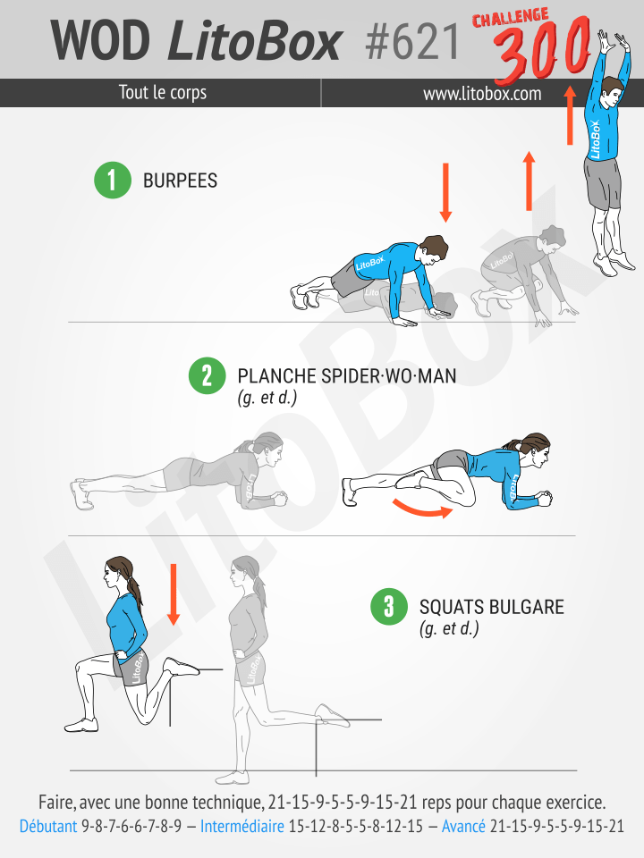 1er tour : 21 burpees, 21 planche spiderman (21 à gauche et 21 à droite, alternativement) et 21 squats bulgares (21 à gauche et 21 à droite),