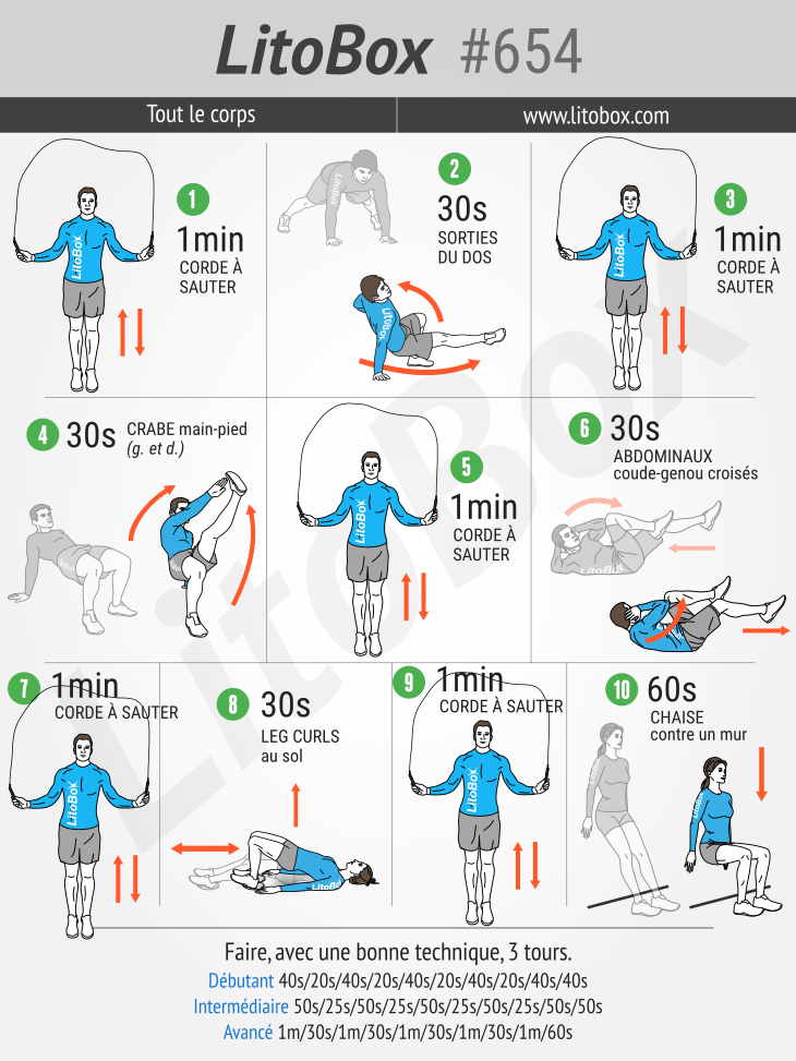 Sauts à la corde : alterne une fois sur deux : 1 intervalle courir sur place (levés de genou) et 1 autre mountain climbers → ou toute autre activité cardio (rameur, course à pied …).