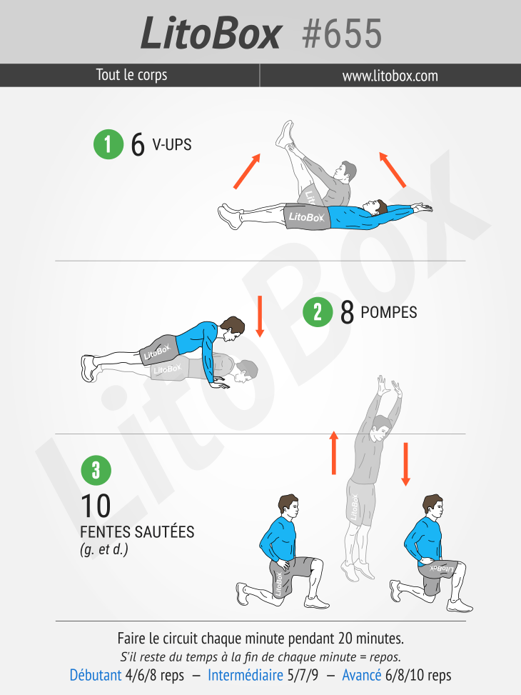 Fais ce dimanche en montant un peu à 8 v-ups / 10 pompes / 12 fentes. Ça me laissait une douzaine de secondes à chaque minute. Sur le moment, c’est bien passé, mais belles courbatures le lendemain !
