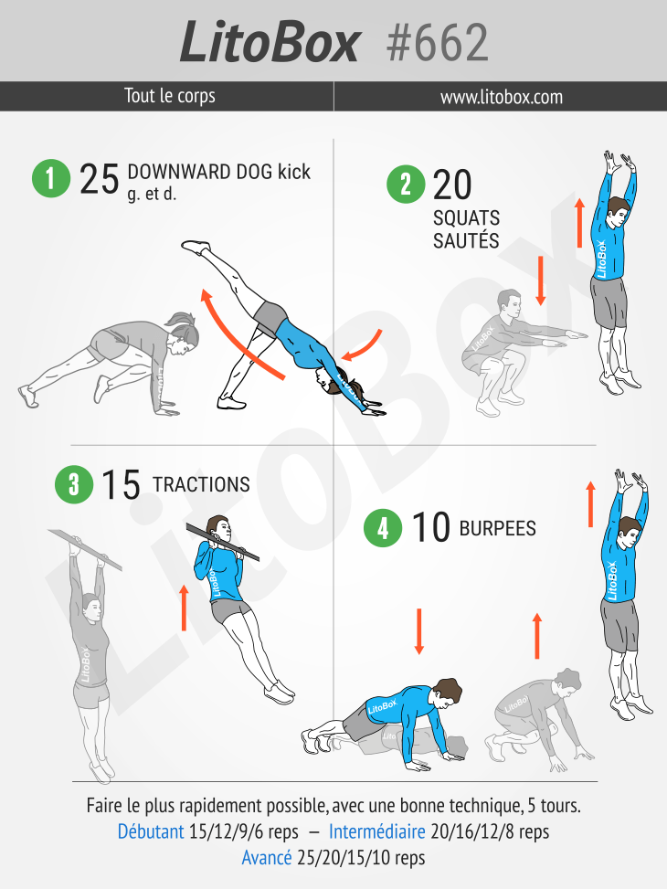 Si tu peux faire les 4 tours rincé en assurant une bonne technique dans l’exécution de tes répétitions, c’est le choix que je préfère. Mais 5 tours « plus tranquilles » te feront une bonne séance efficace également.