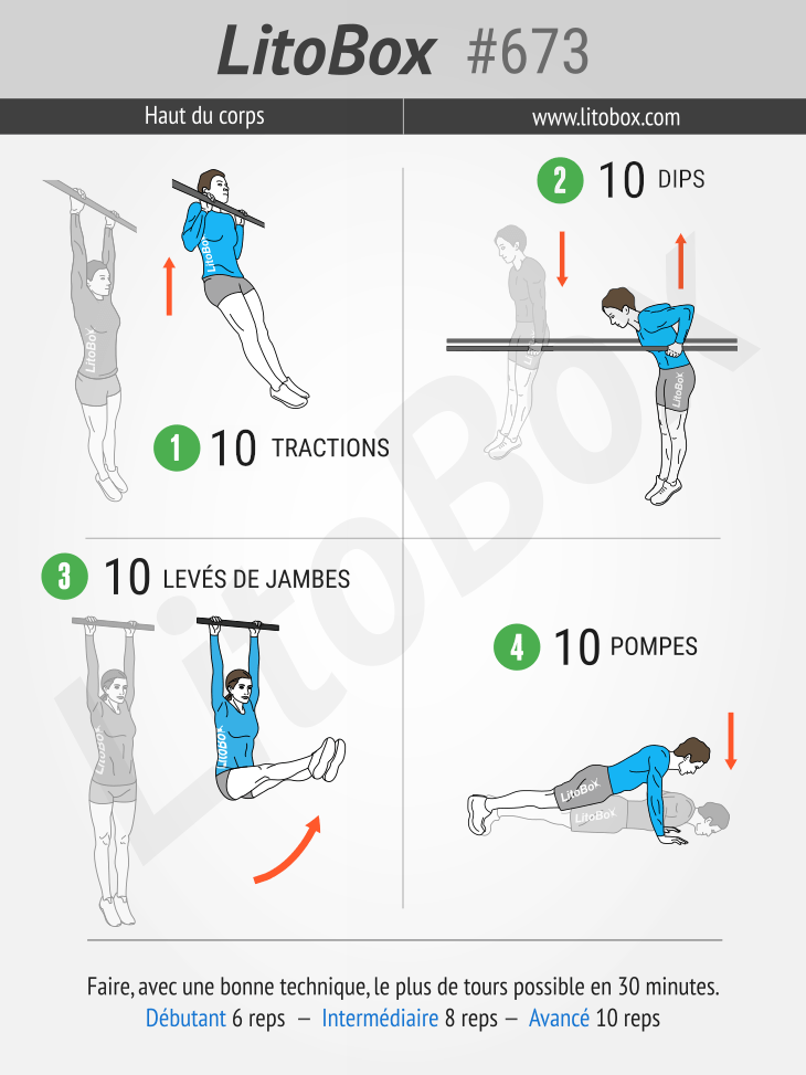 7 tours en Intermédiaire pour les bras et Avancé pour les abdos.