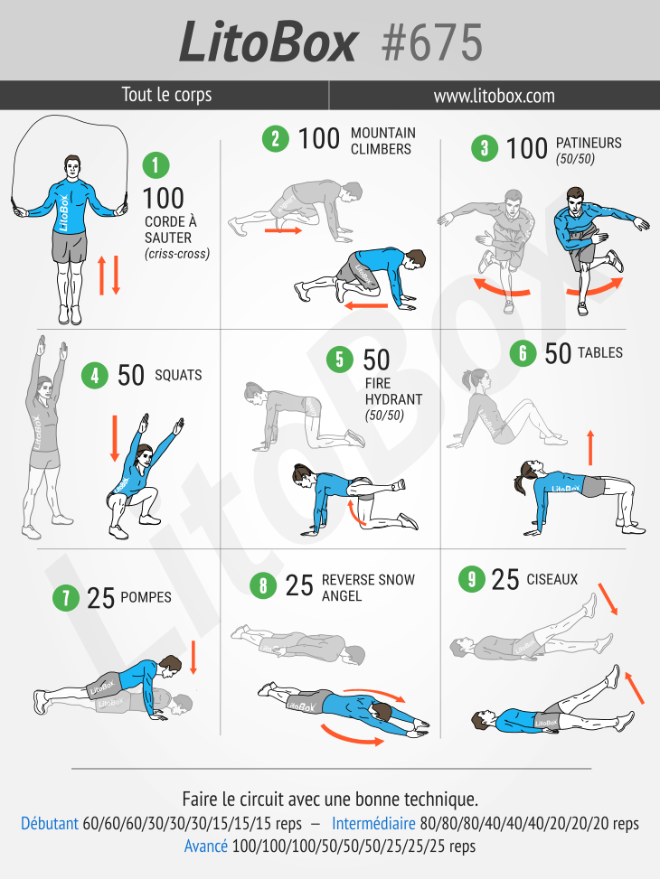 | Débutant | 60/60/60/30/30/30/15/15/15 reps |