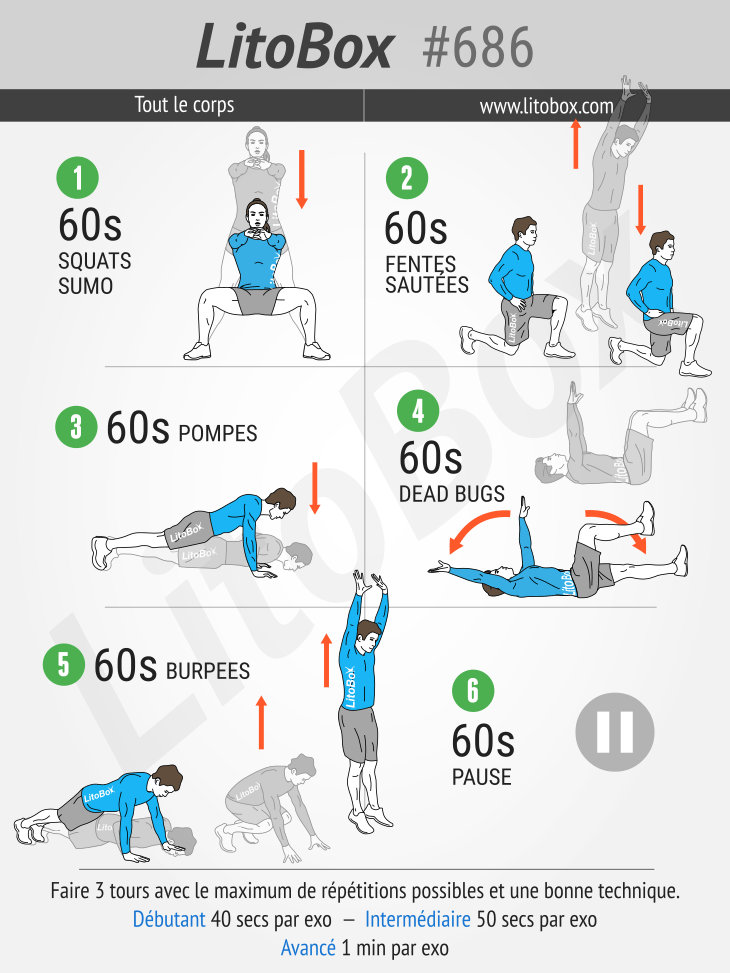 C’est une séance courte et efficace avec des exercices au poids du corps que l’on peut programmer et faire malgré une semaine bien remplie.