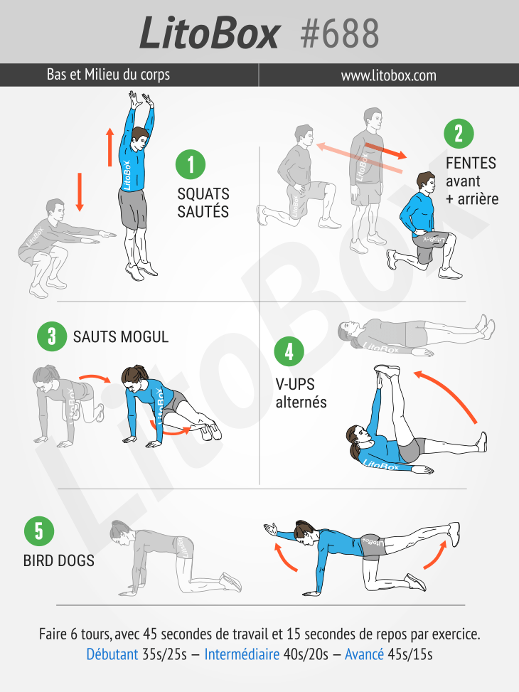 Faire 6 tours avec 45 secondes de travail et 15 secondes de repos par exercice de :