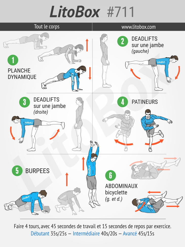 Faire 4 tours avec 45 secondes de travail et 15 secondes de repos par exercice de :