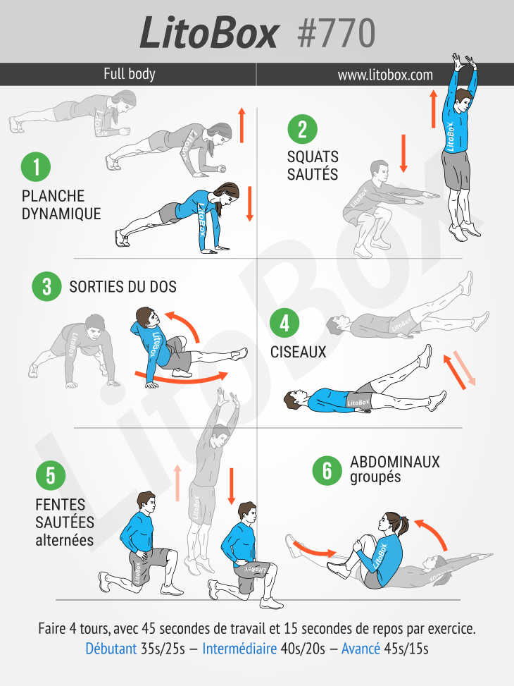 Faire 4 tours avec 45 secondes de travail et 15 secondes de repos par exercice :