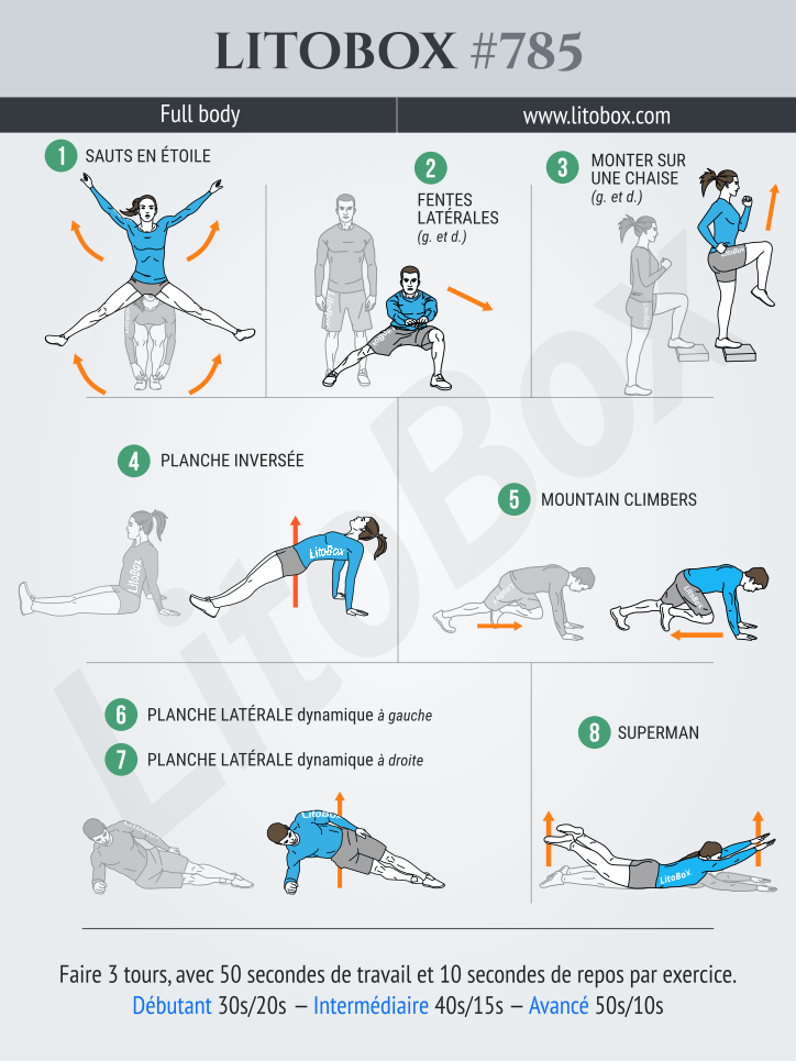 Faire 3 tours avec 50 secondes de travail et 10 secondes de repos par exercice de :