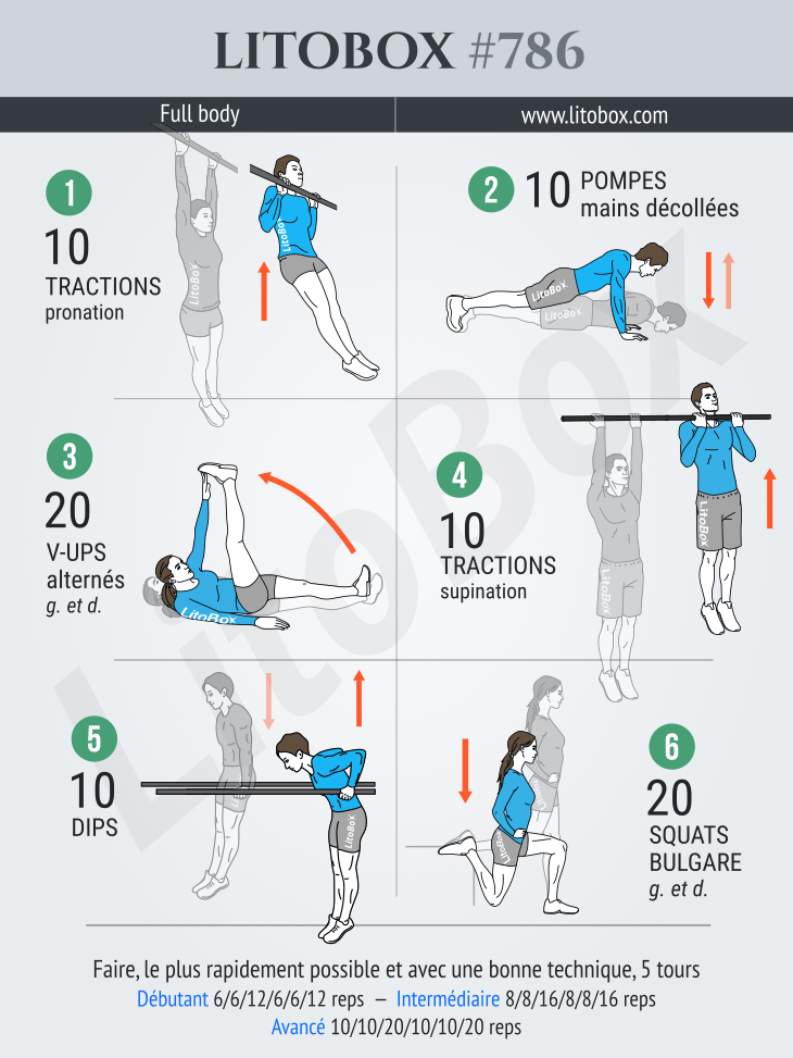 Faire le plus rapidement possible et avec une bonne technique, 5 tours de :