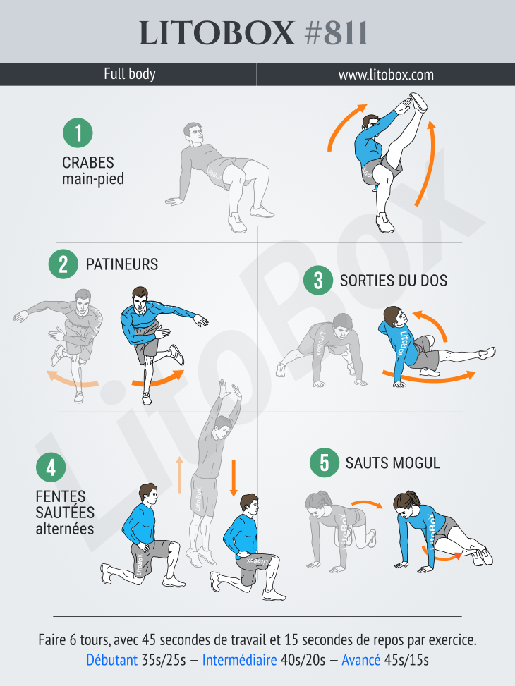 Faire 6 tours avec 45 secondes de travail et 15 secondes de repos par exercice :